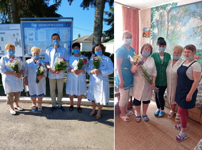 Работников учреждения в профессиональный праздник поздравляли коллеги, члены семьи, друзья и знакомые. Председатель Профсоюза работников здравоохранения и председатель первичной профсоюзной организации работников здравоохранения поздравили коллектив, активисты из числа членов профсоюза были награждены грамотами. Также была организована фотозона, декорации приготовила дочь заведующей социально реабилитационного отделения.