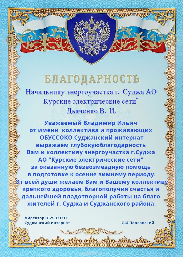 "Благодарим Дьяченко В.И."