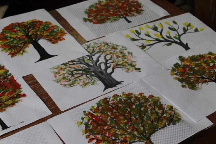 Прямо с самого утра.... Строчки этого стихотворения ярко описывают сегодняшний день, дождь с самого утра, серое небо, но в нашем доме продолжается золотая осень полная ярких красок. Ребята сегодня учились рисовать ,не очень привычным образом, вместо кисточек, фломастеров и карандашей - губками для мытья посуды. Красиво, красочно, а главное очень понравилось нашим проживающим.