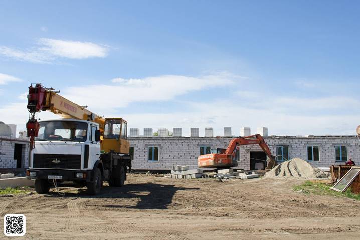 Уже сейчас на стройке завершается укладка стен корпуса, рабочие проводят к зданию коммуникации, а во дворе появилась новая водонапорная башня, которая будет обеспечивать социальный Дом.