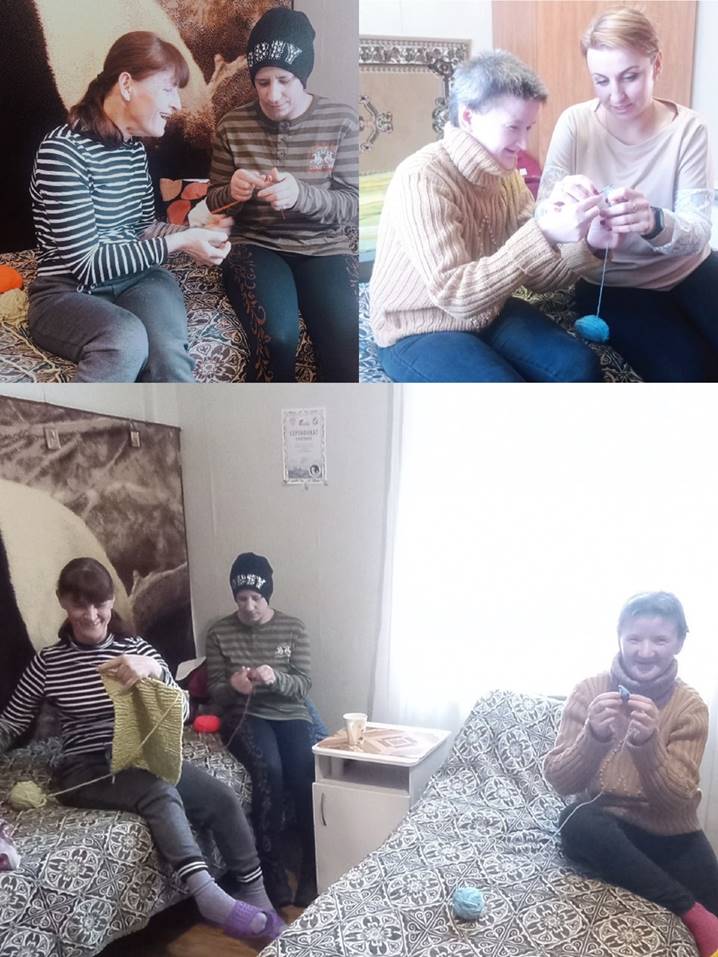 . Пока ребята строили крепость наши девочки занимаются вязанием, кто то уже умеет и с удовольствием вяжут сами и учат других. В отделениях интенсивного ухода проживающие проводят время за просмотром телепередач, а также весёлые, заводные песни помогают проснуться утром и получить заряд энергии на целый день.