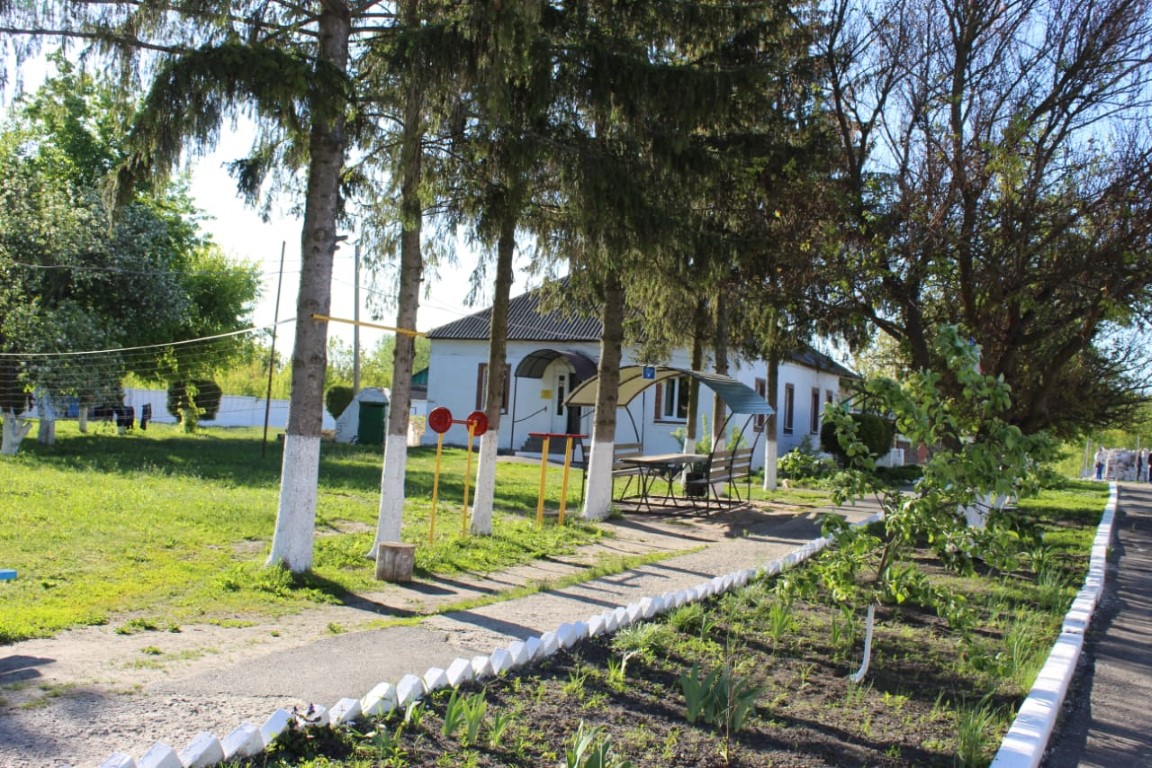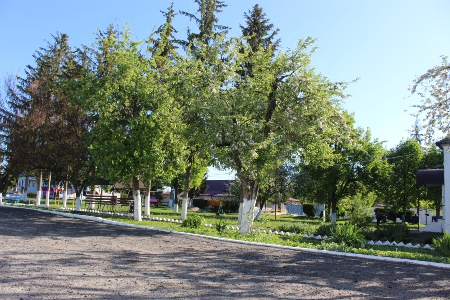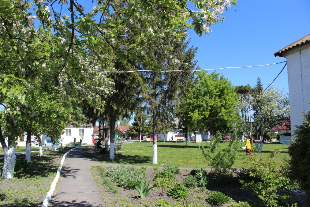 Возле каждого корпуса, для отдыха проживающих, расположены беседки и клумбы. Везде на территории растут плодовые деревья, а так же липа, туи, ёлки и даже вековая крымская сосна.