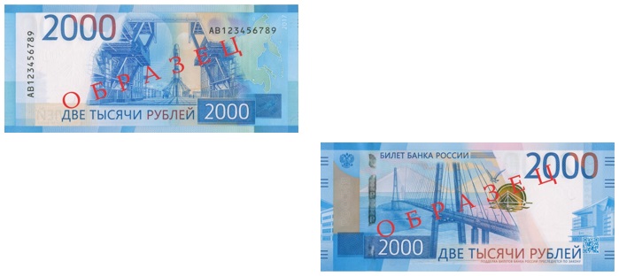 Банкнота номиналом 2000 рублей выполнена преимущественно в синем цвете. На ее лицевой стороне изображен мост на остров Русский, на оборотной – космодром «Восточный» в Амурской области. Оптически-переменный защитный элемент выполнен в виде стилизованного изображения моста на фоне солнца.